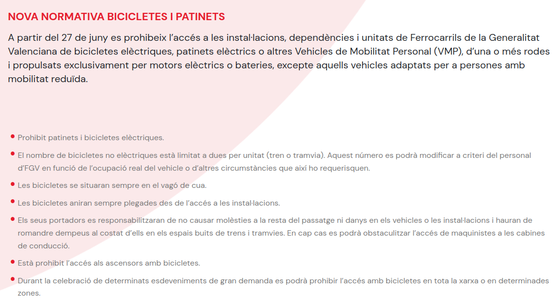 Arran de les inundacions del 29 d’octubre de 2024 que van arrasar amb l’Horta Sud i que van afectar greument les infraestructures de transport, l’1 de desembre de 2024 Ferrocarrils de la Generalitat Valenciana va adoptar la decisió de prohibir l’accés de bicicletes als seus combois, amb l’argument de garantir l’espai per al major nombre possible de persones usuàries.