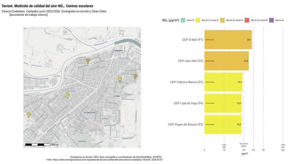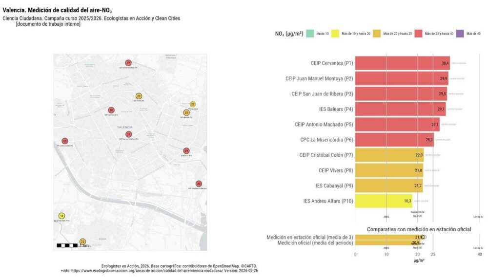 Ecologistes en Acció de València, València en bici-AE Agró i Soterranya han participat en la cinquena campanya de ciència ciutadana de mesurament de diòxid de nitrogen (NO2) en entorns escolars. Dels deu centres analitzats, sis centres escolars superen el límit diari recomanat per l’Organització Mundial de la Salut (OMS) per a la protecció de la salut, establit en 25 μg/m³. Diàriament eixos entorns escolars estarien exposats a nivells que es relacionen amb l’augment dels ingressos hospitalaris i de la mortalitat per malalties respiratòries i cardiovasculars.
